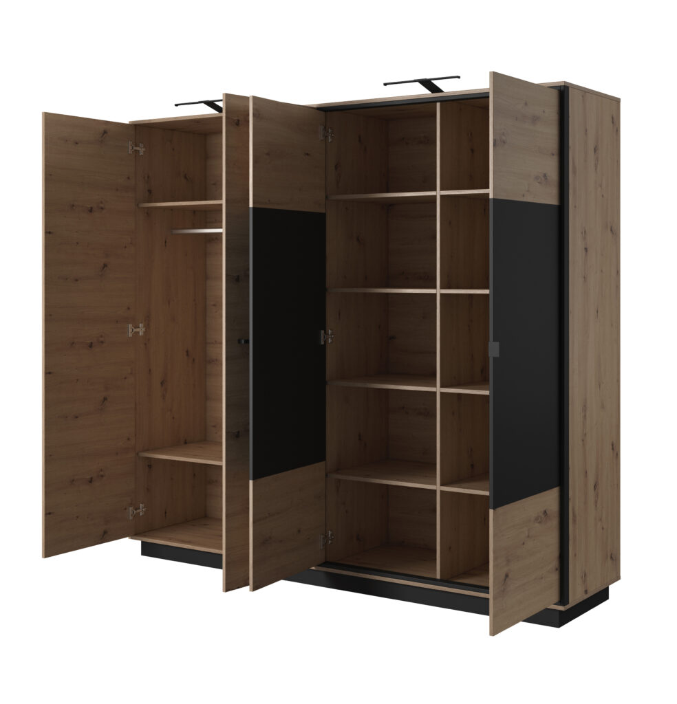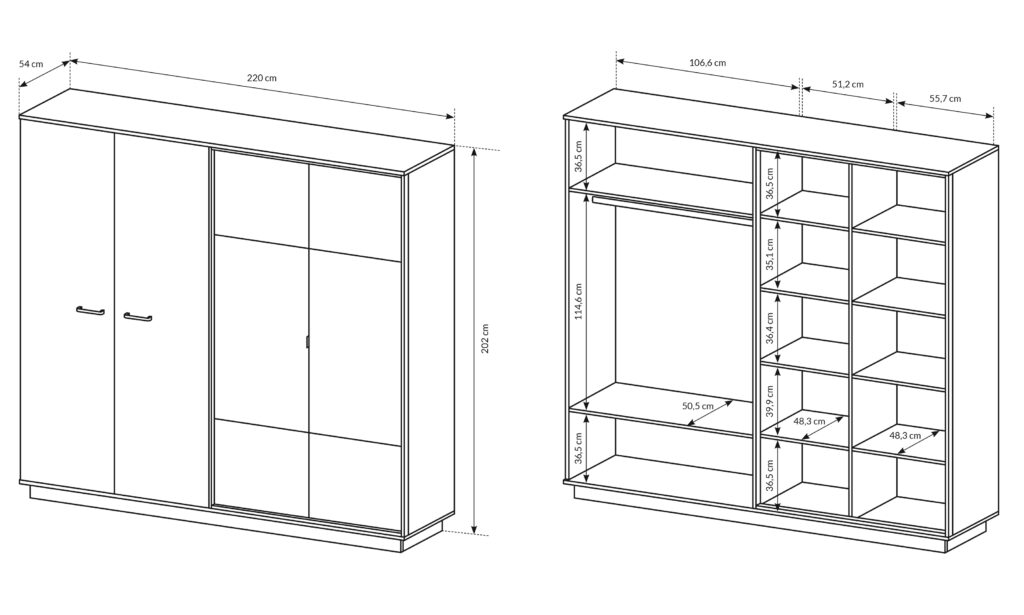 Garderobemål med finish: høyde - 215cm; bredde - 231,5 cm; dybde - 65 cm