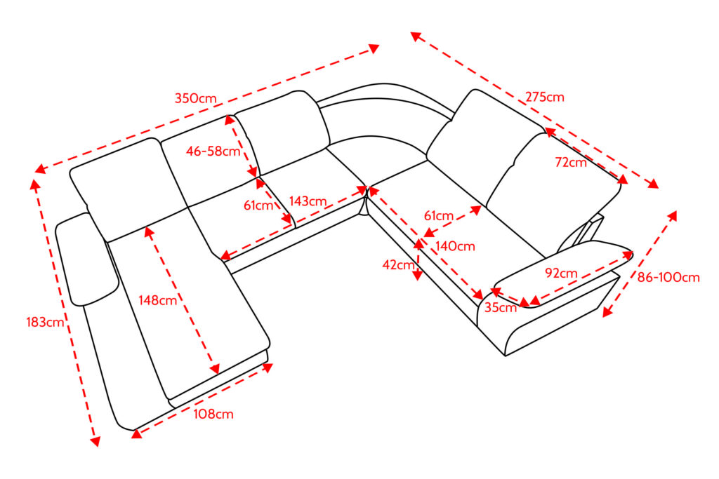 Mål: H: 86-100cm B: 350cm D: 183-275cm